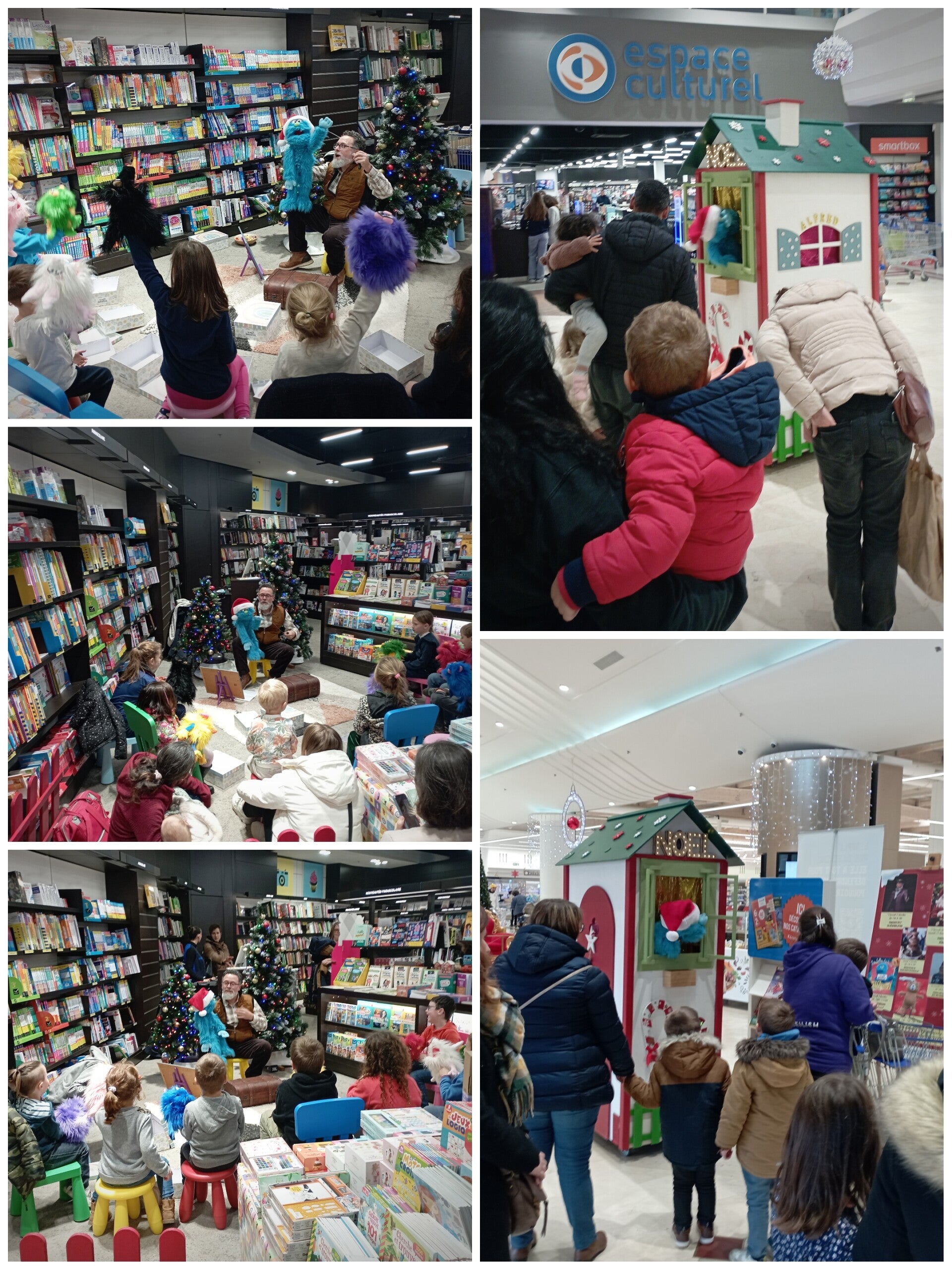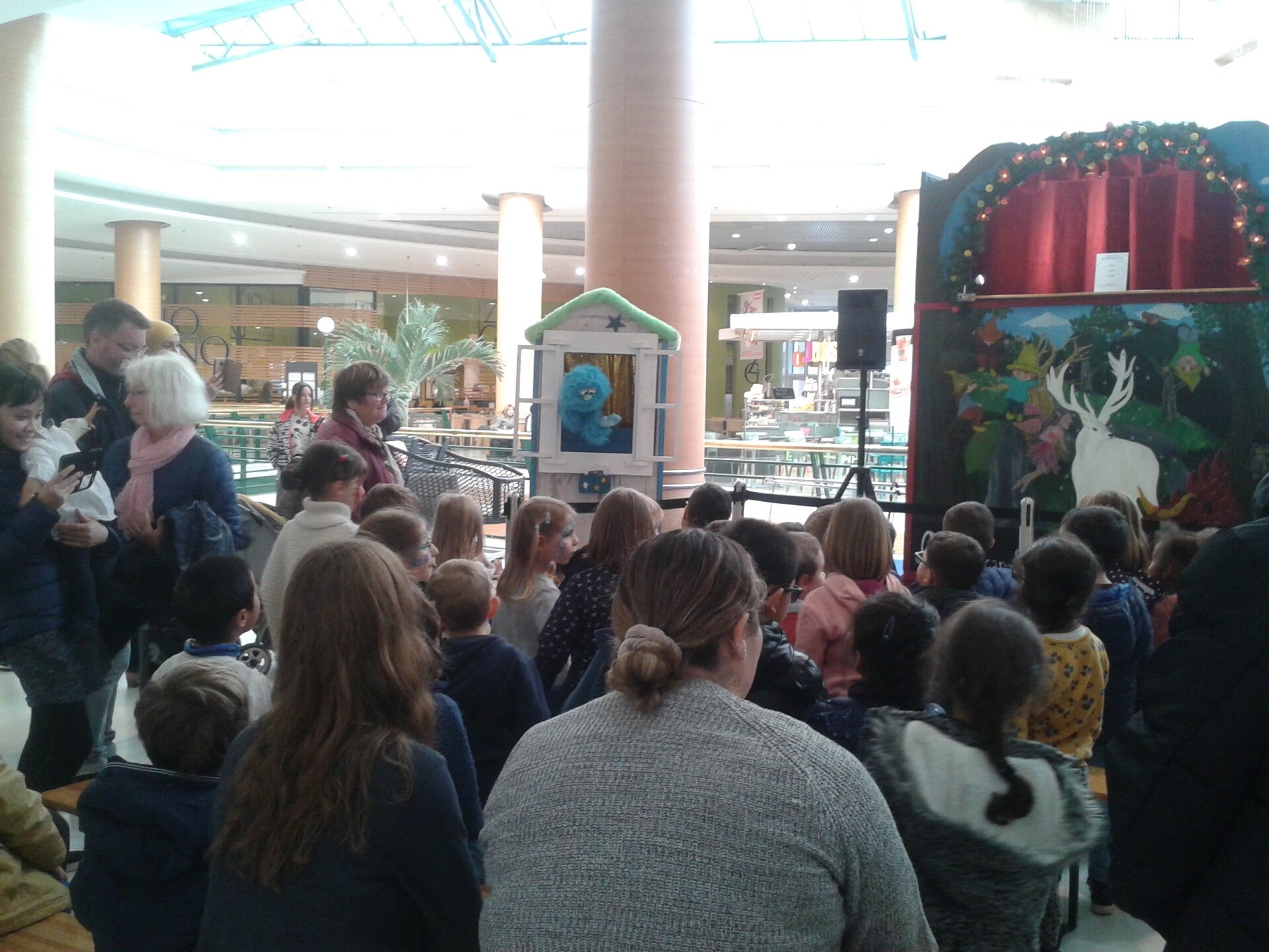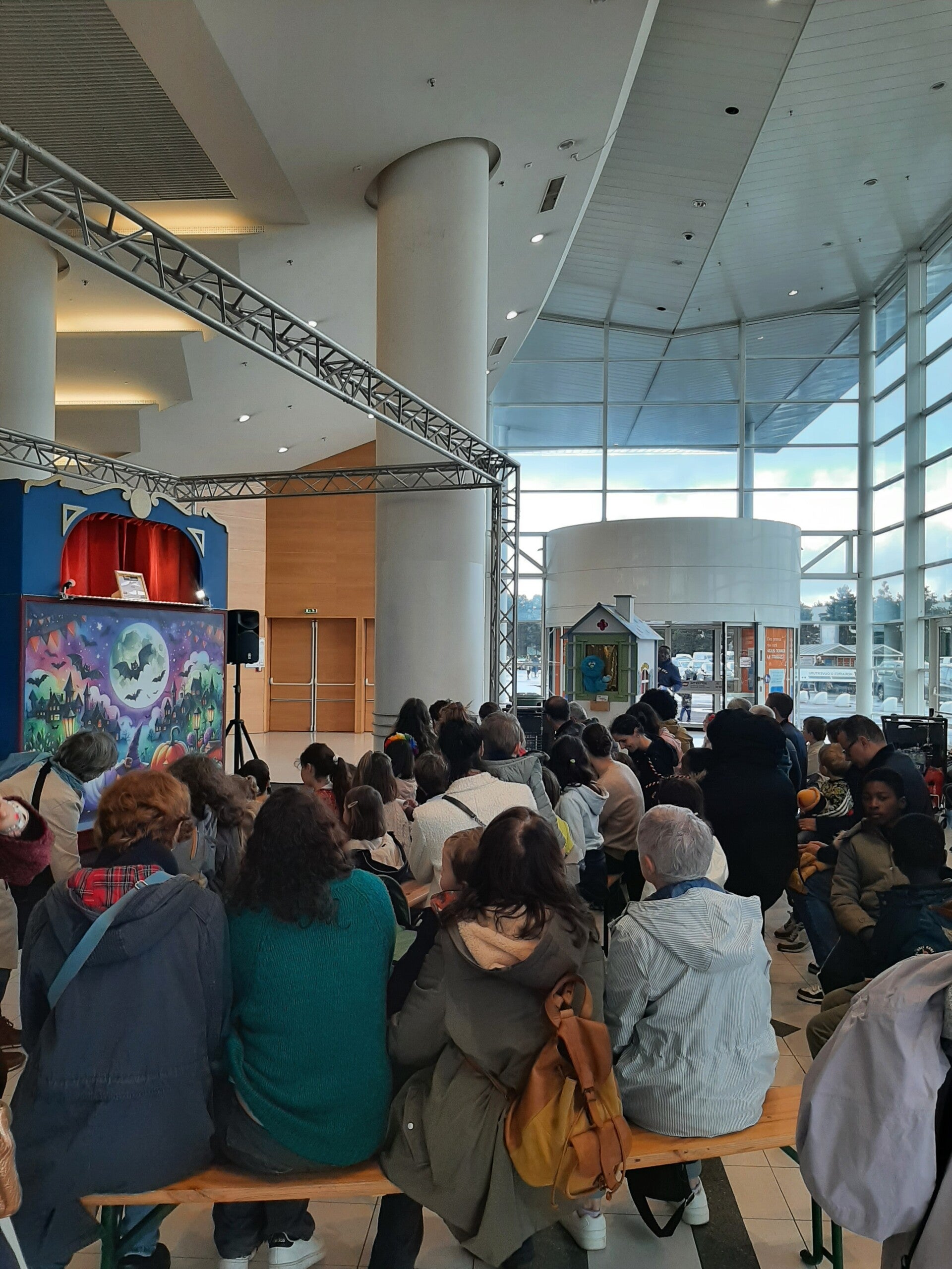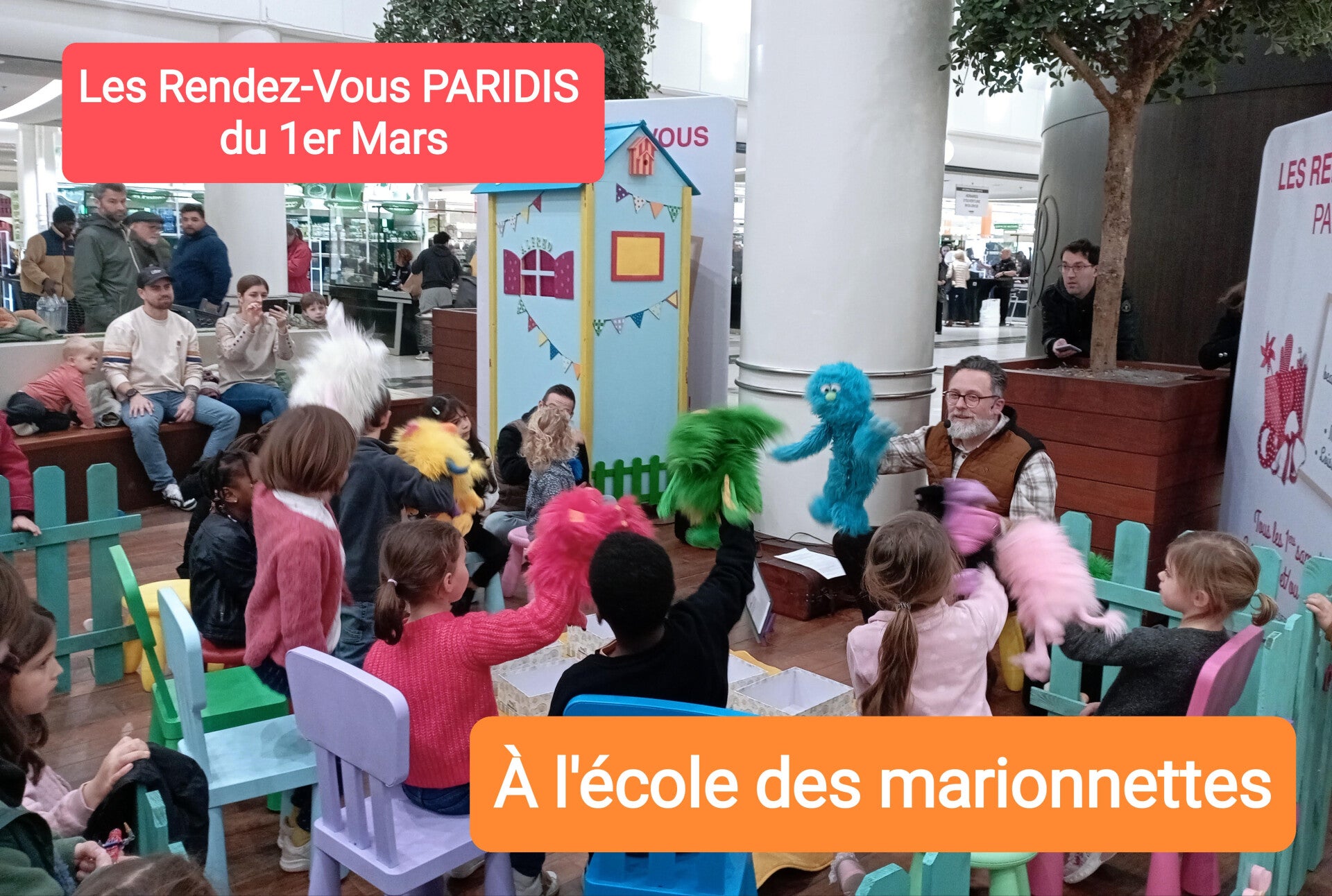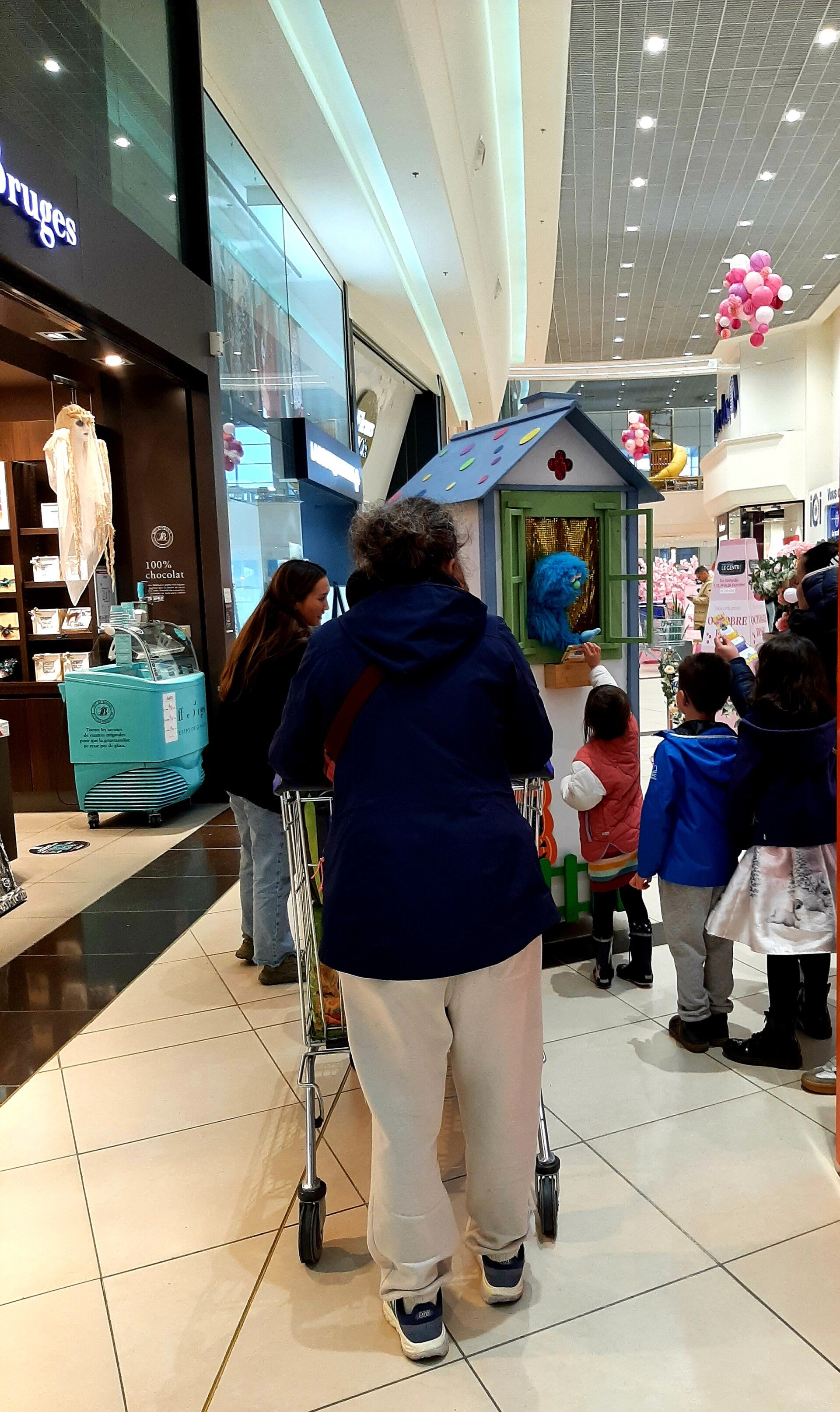 Avant le spectacle, Alfred, la marionnette bleue, déambule dans son théâtre mobile pendant 30 min dans les couloirs de la galerie à la rencontre des enfants.